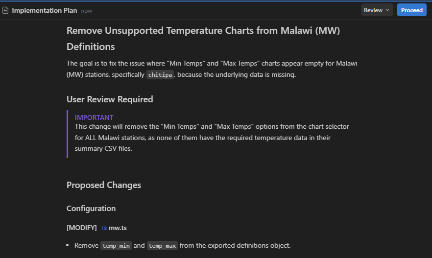 This is actually quite a complex prompt, as the AI needs to discover how data is loaded, and why data may show for some specific stations and not others. Only then is it able to move onto potential solutions.